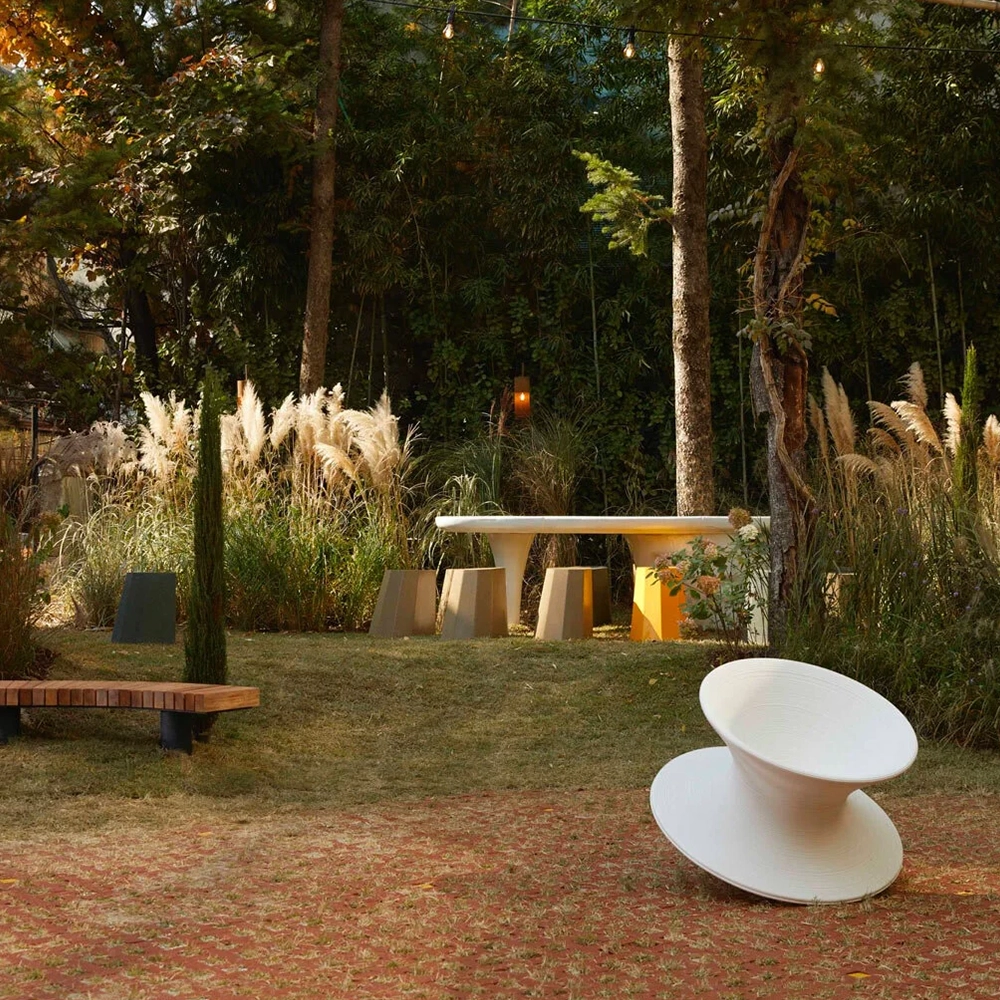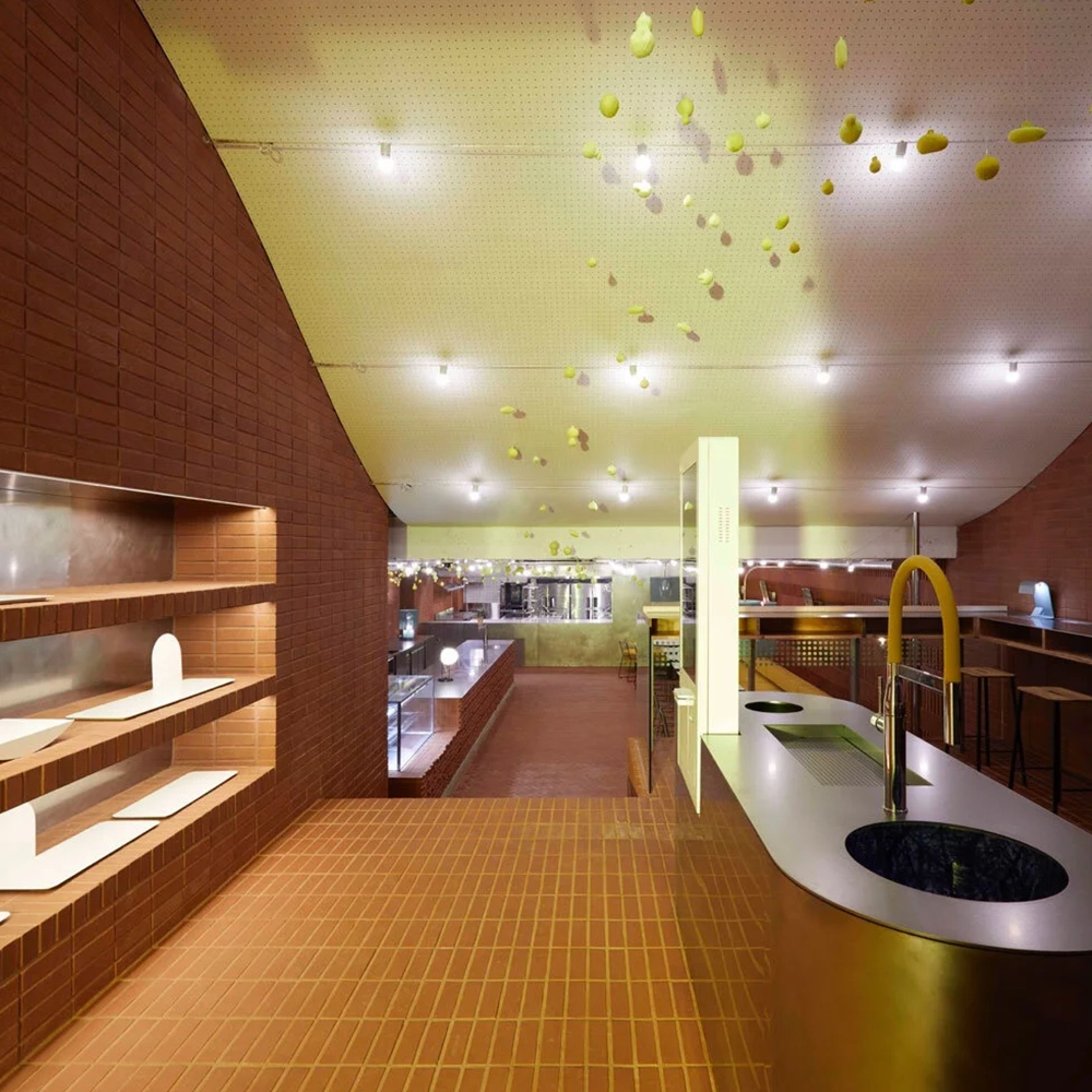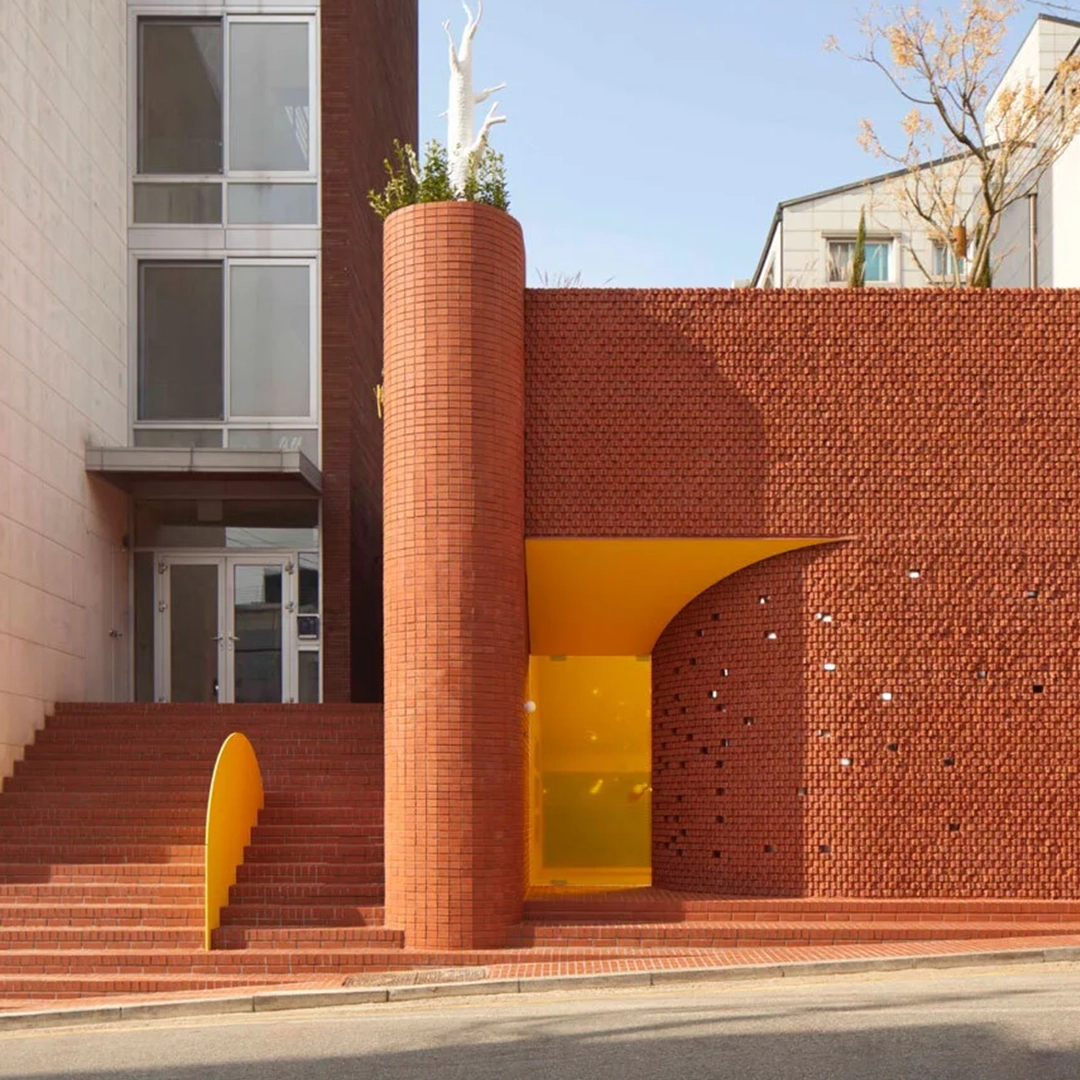 The space itself is large with an outdoor terrace and garden which links with the six different social spaces. For us, the most striking feature is the brick entrance which has a striking yellow soffit that draws your attention and is Ottogi signature language and this feature makes the facade stand out against the local architecture.