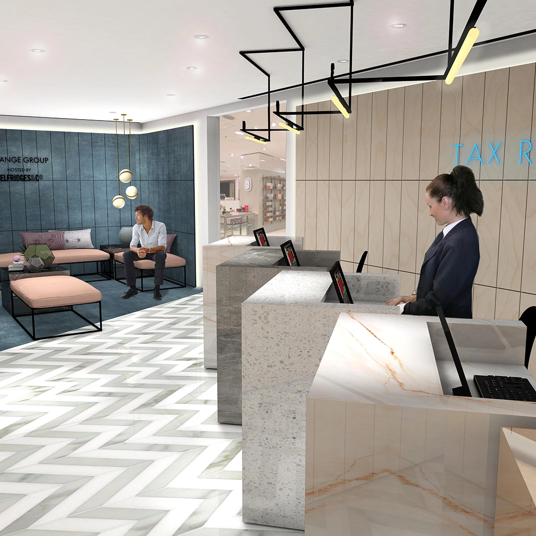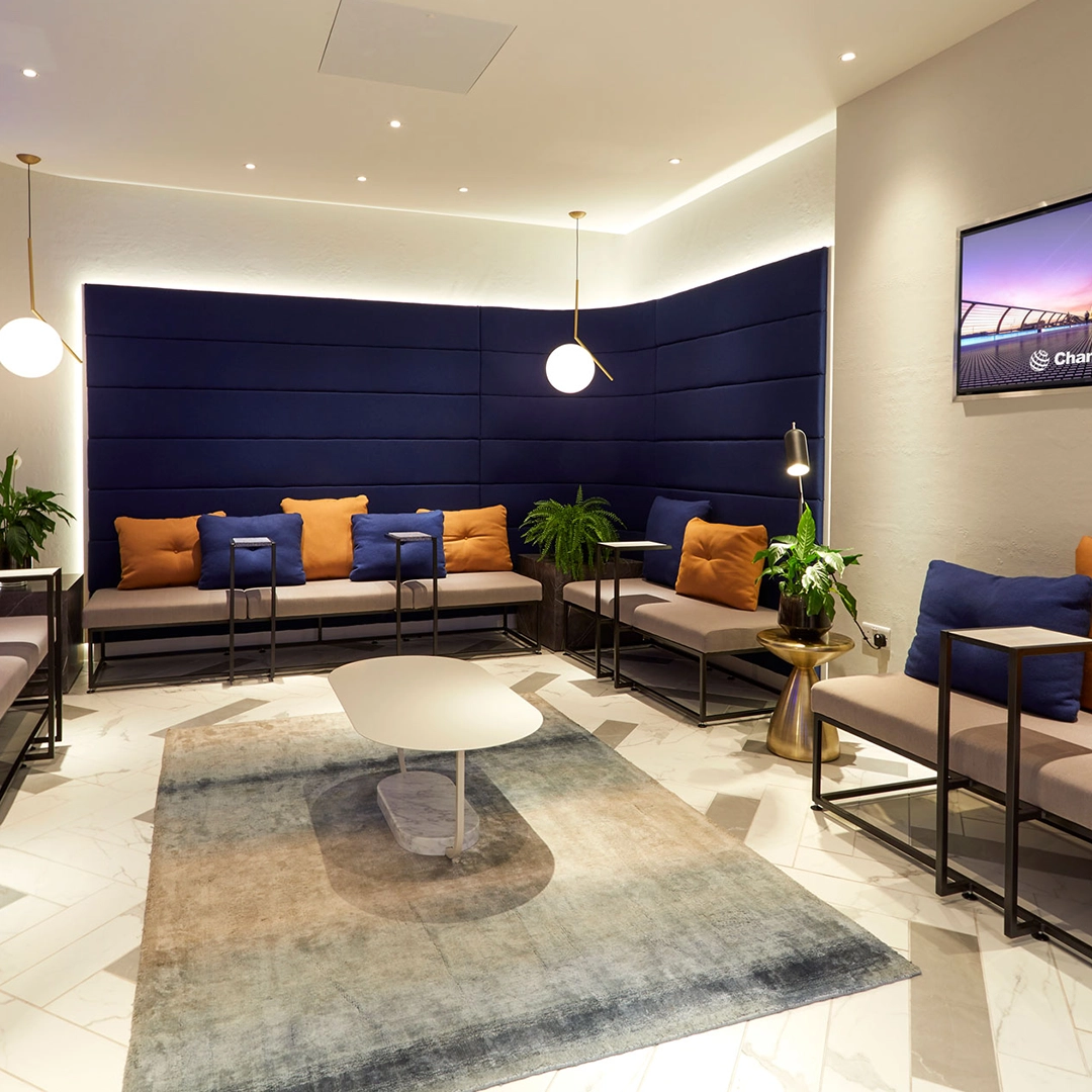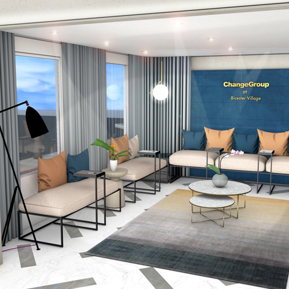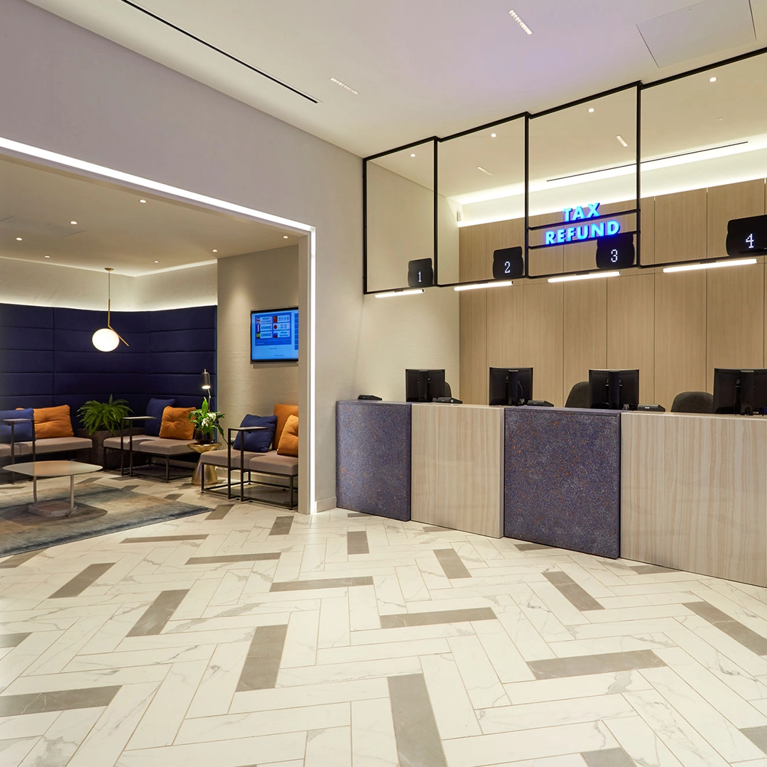 We explored how traditional materials could be used in fresh ways. At Bicester Village, we gave the interior a fashion-led edge, with offset counter pods and no security glass, allowing staff to interact directly with customers. Fabric seating and textured walls added comfort to waiting areas, creating a more relaxed environment.