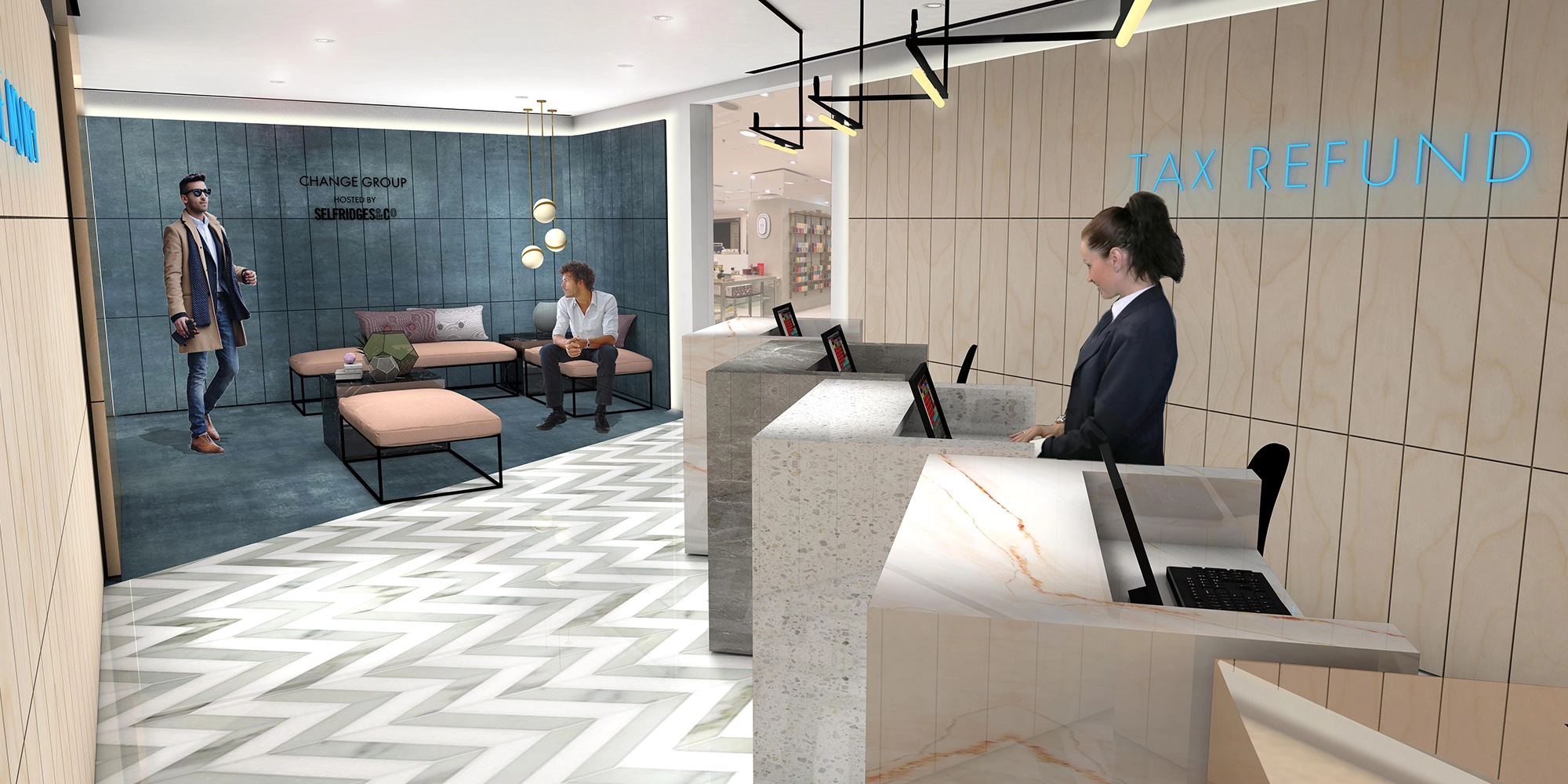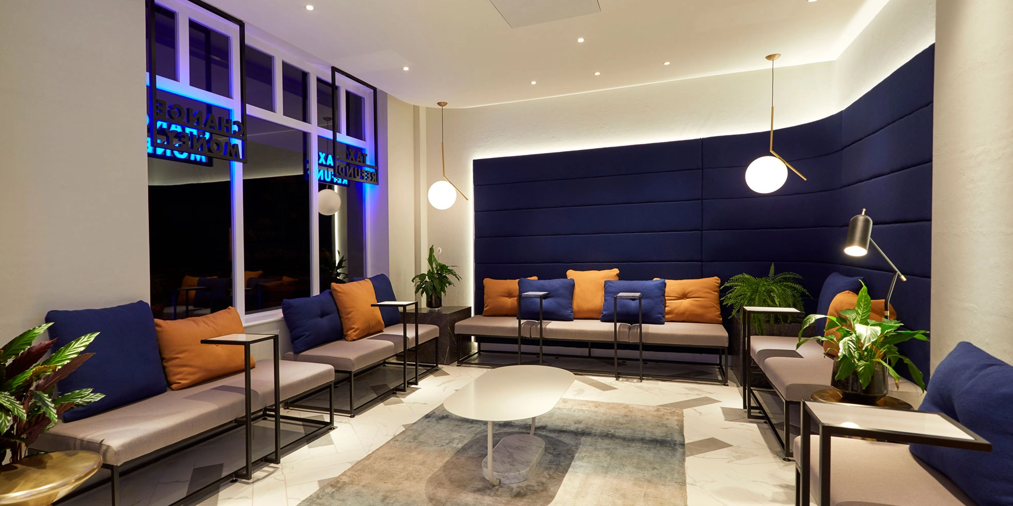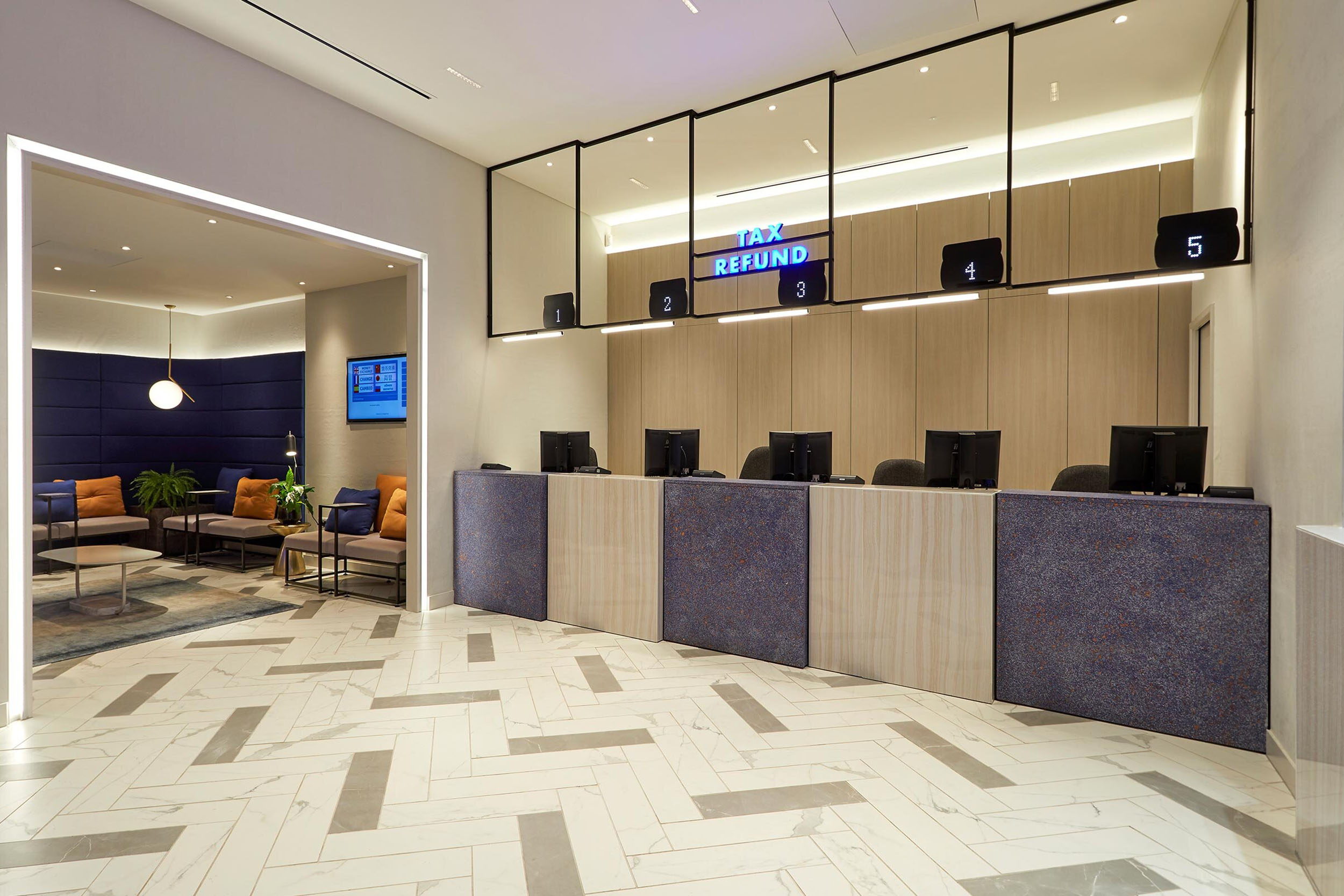 We explored how traditional materials could be used in fresh ways. At Bicester Village, we gave the interior a fashion-led edge, with offset counter pods and no security glass, allowing staff to interact directly with customers. Fabric seating and textured walls added comfort to waiting areas, creating a more relaxed environment.