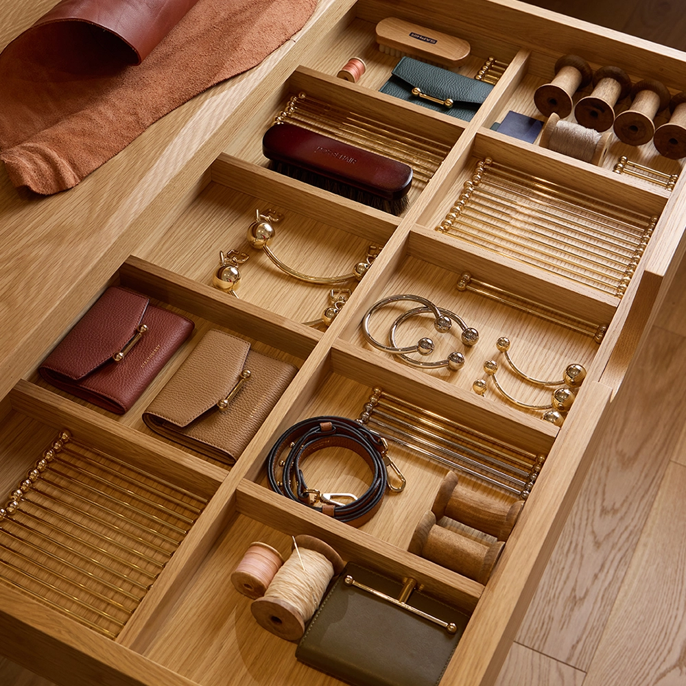 We transformed the lounge into a dedicated atelier that put making at the heart of the space. Period details were retained and restored, then paired with bespoke furniture and display to frame the handbags as crafted objects. The space was designed to be lived-in: a working environment where prototypes could be mocked up, pieces restored and the link between product and process made visible.